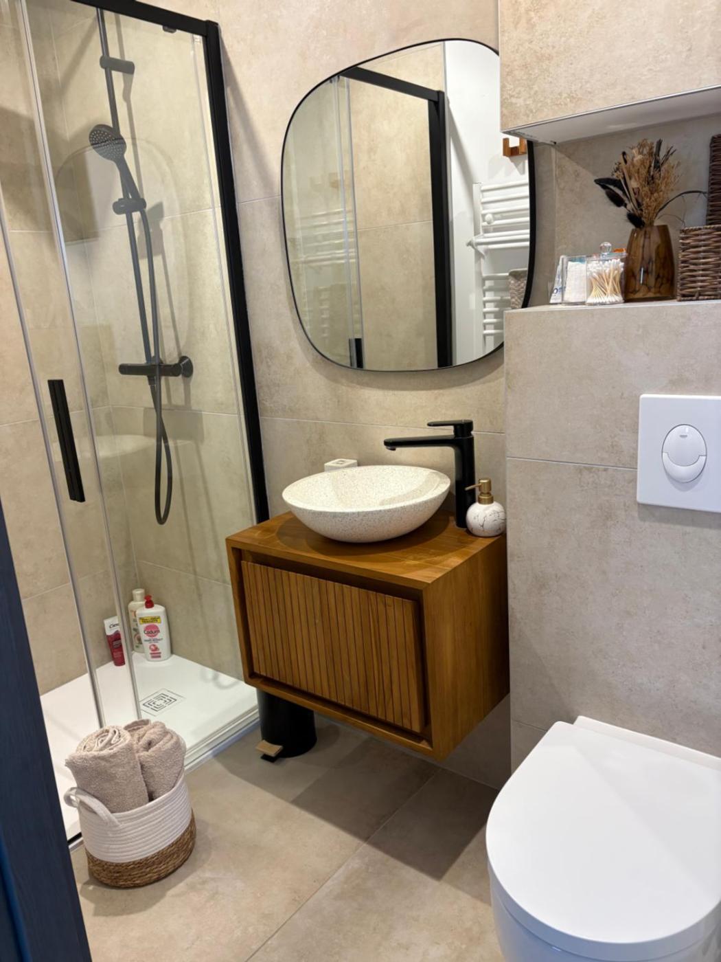 Appartement 1 Chambre. Featuring a private entrance, this air-conditioned apartment comprises a kitchen, 1 bedroom and 1 bathroom with a shower and a hairdryer. In the well-equipped kitchen, guests will find a stovetop, a refrigerator, kitchenware and a microwave. Boasting a terrace, this apartment also provides soundproof walls, a tea and coffee maker and a flat-screen TV. The unit offers 1 bed.