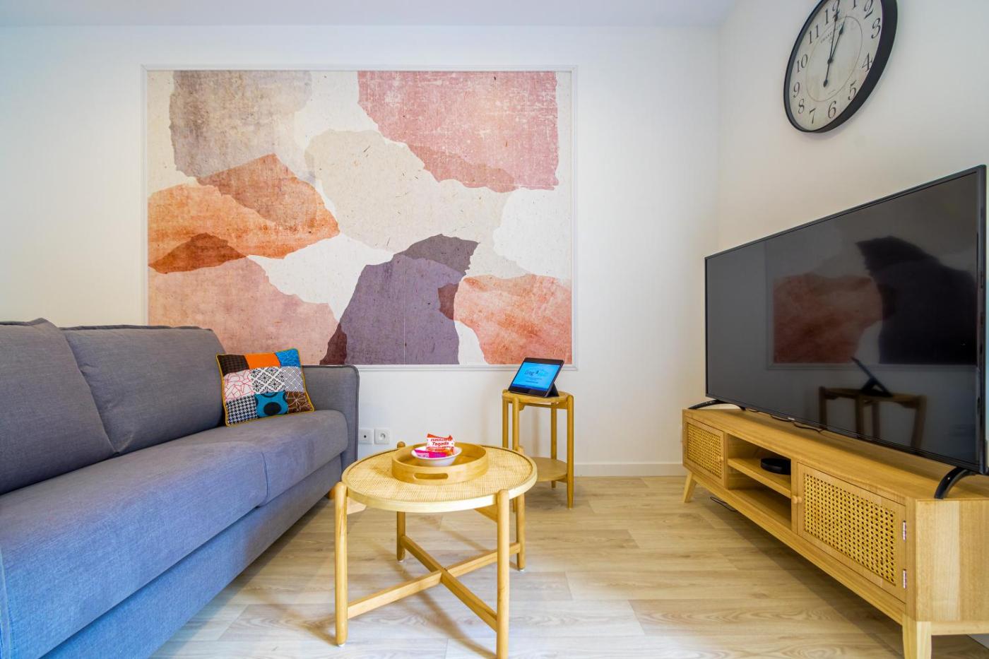 Cet appartement compte 1 chambre, un salon comportant une télévision à écran plat, et une cuisine entièrement équipée.