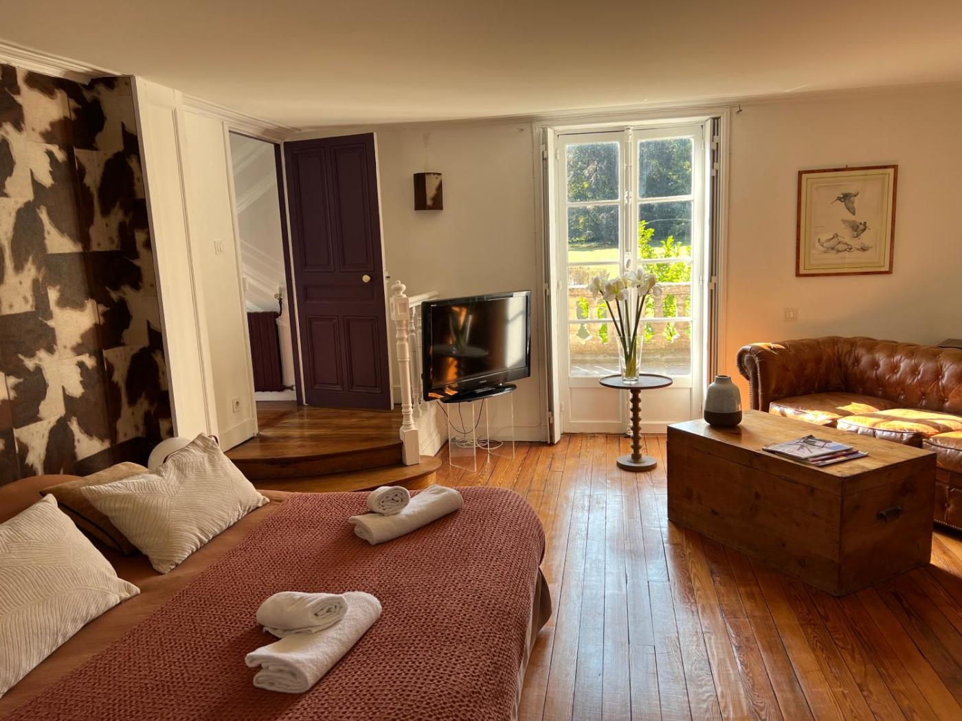 Chambre Double - Vue sur Jardin. The spacious double room offers a sofa, parquet floors, as well as a private bathroom featuring a shower and a hairdryer. The double room features heating and garden views. The unit offers 1 bed. ;