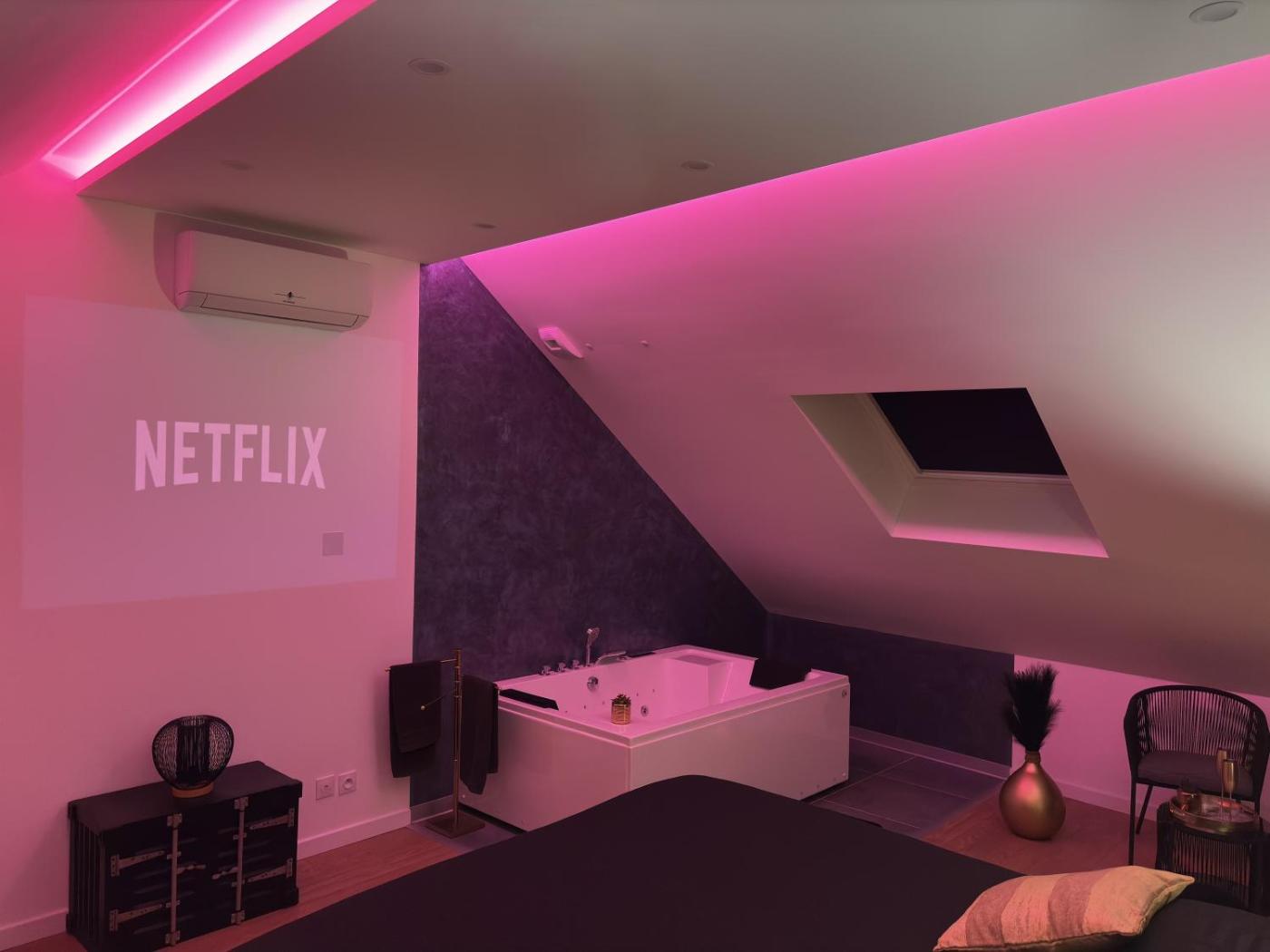Appartement 1 Chambre. Guests will have a special experience as this apartment provides a hot tub and a spa bath. The spacious apartment features 1 bedroom and 1 bathroom with a walk-in shower and free toiletries. In the well-fitted kitchen, guests will find a stovetop, a refrigerator, a microwave and a toaster. The apartment offers air conditioning, a coffee machine, a dining area, heating and a flat-screen TV with streaming services. The unit offers 1 bed.