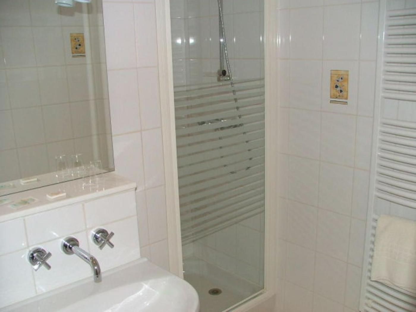 Chambre Double. With a view of the garden, the room features wooden floors, a wardrobe and an electric kettle. The private bathroom is complete with a bath tub or shower, toilet and hairdryer. ;