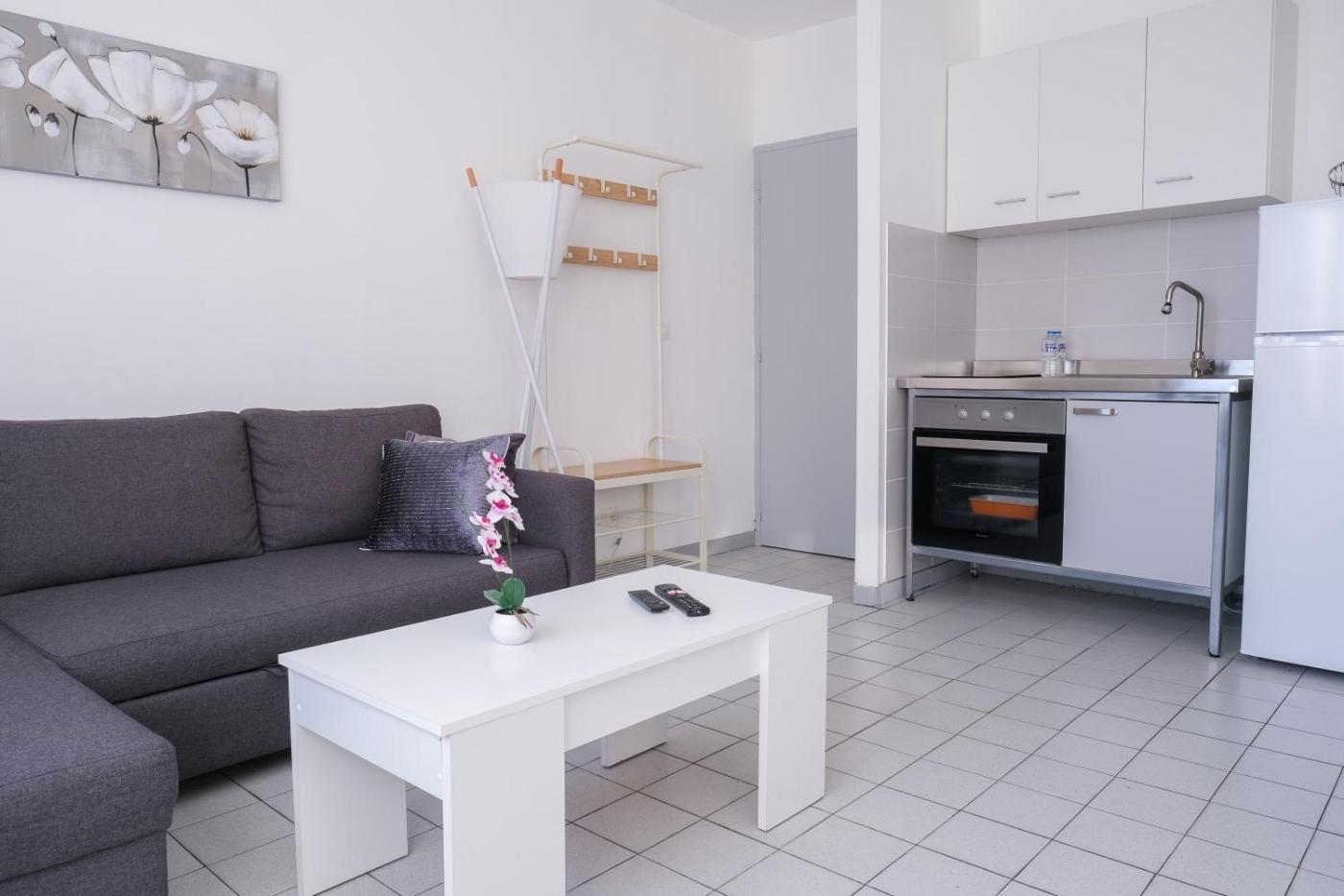 Appartement 1 Chambre. This apartment consists of 1 living room, 1 separate bedroom and 1 bathroom with a shower and free toiletries. Guests can make meals in the kitchen that is equipped with a stovetop, a refrigerator, kitchenware and an oven. The apartment provides a washing machine, a tea and coffee maker, a seating area, a flat-screen TV with cable channels, as well as city views. The unit offers 2 beds.