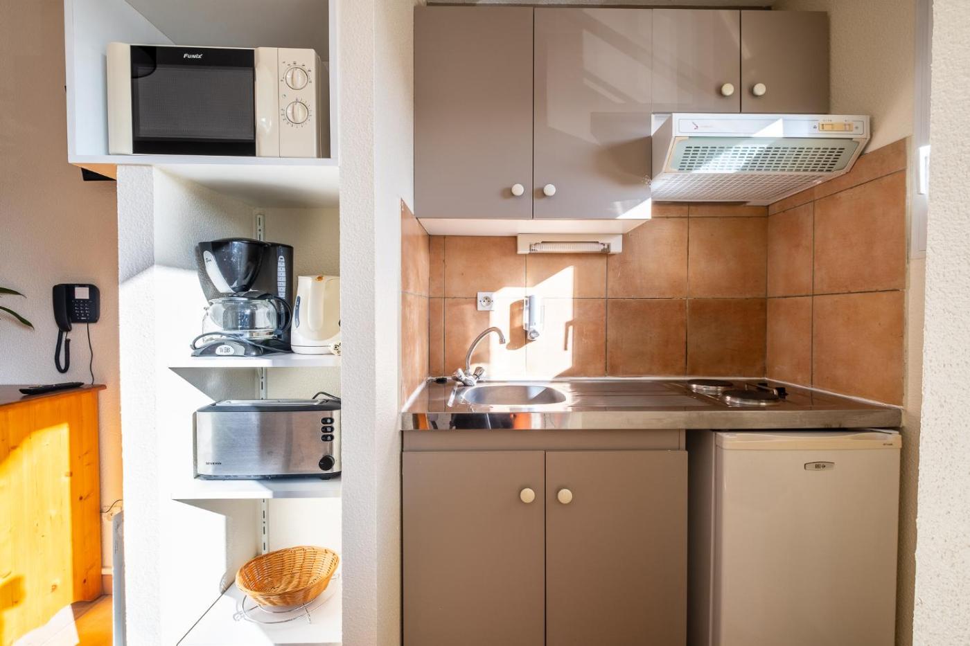 Studio. La kitchenette est équipée de plaques de cuisson, dun réfrigérateur, d’un micro-ondes et dustensiles de cuisine. Ce studio insonorisé dispose dun plateaubouilloire, dun balcon avec vue sur la ville et dune salle de bains privative avec baignoire. Ce logement comporte 1 lit. ;