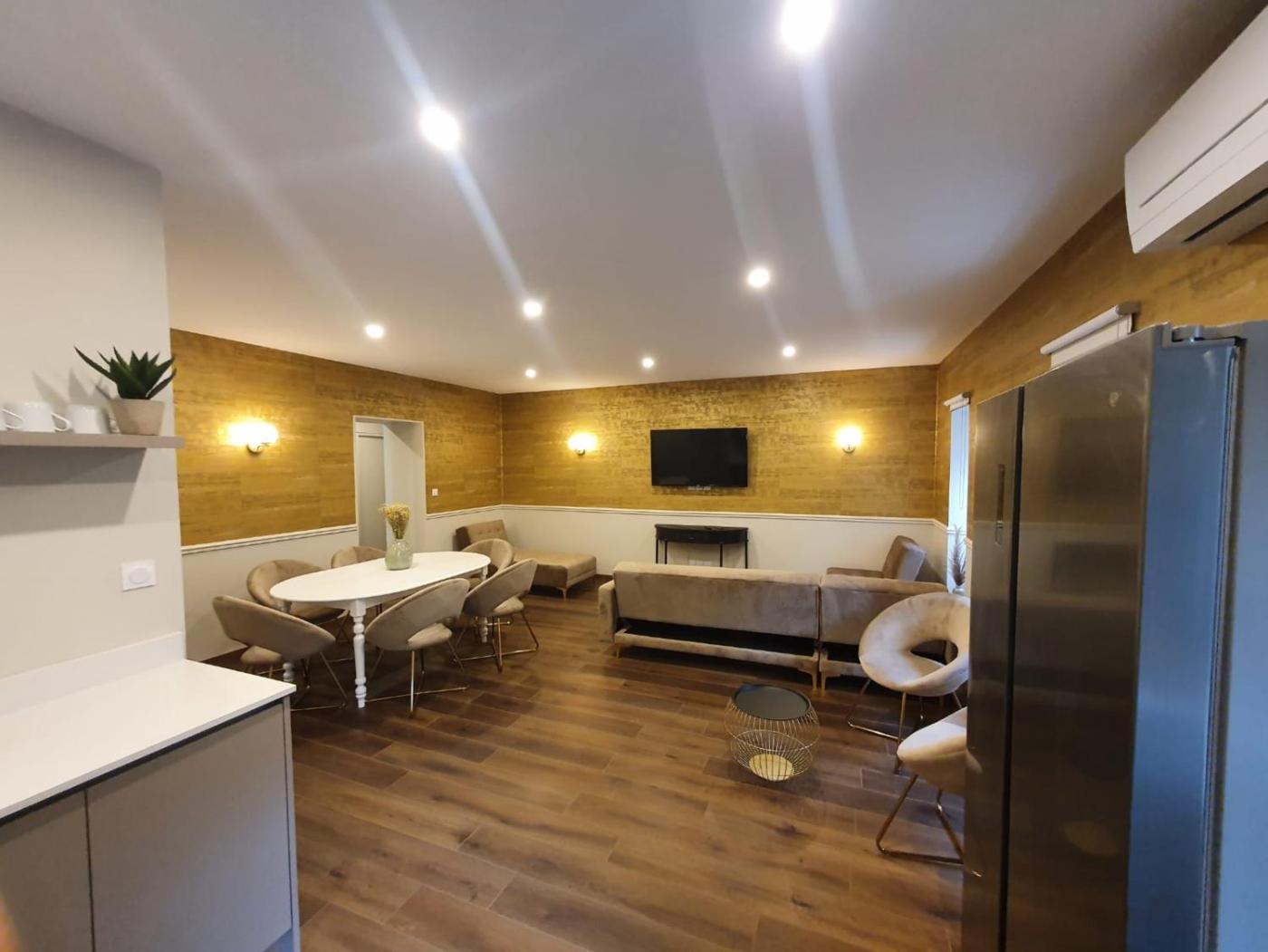 Appartement 3 Chambres. This spacious apartment is comprised of 1 living room, 3 separate bedrooms and 1 bathroom with a walk-in shower and a hairdryer. Guests can make meals in the kitchen that comes with a stovetop, a refrigerator, a dishwasher and kitchenware. The air-conditioned apartment offers a flat-screen TV with streaming services, soundproof walls, a tea and coffee maker, a seating area as well as garden views. The unit offers 4 beds.