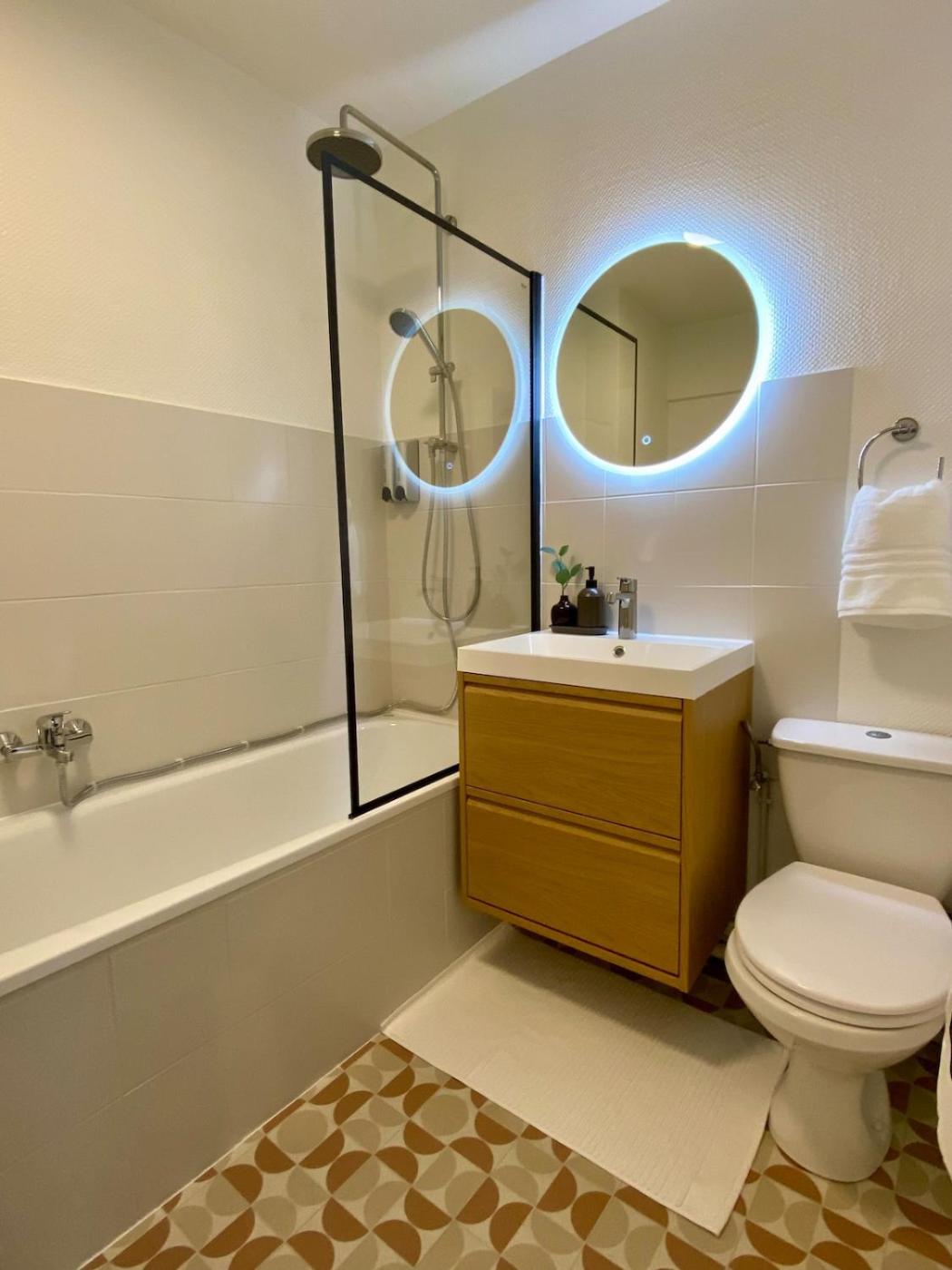Appartement 1 Chambre. This apartment comprises 1 living room, 1 separate bedroom and 1 bathroom with a bath and free toiletries. Meals can be prepared in the kitchen, which comes with a stovetop, a refrigerator, a dishwasher and kitchenware. The apartment provides a coffee machine, a dining area, a high chair for children, a flat-screen TV with streaming services, as well as city views. The unit offers 2 beds.