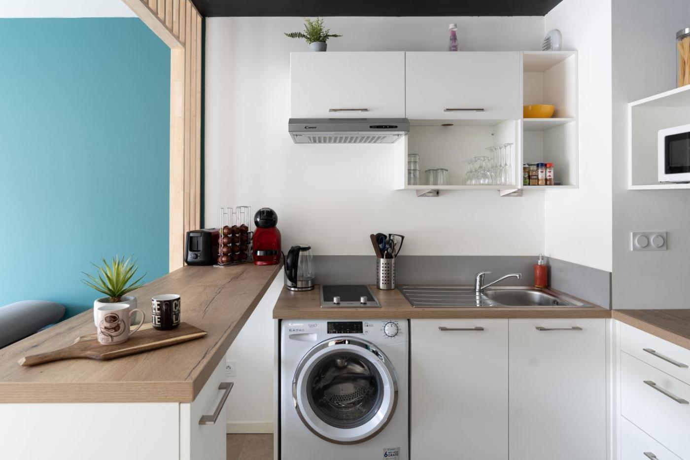 Appartement 1 Chambre. This apartment features 1 living room, 1 separate bedroom and 1 bathroom with a shower and a hairdryer. In the fully equipped kitchen, guests will find a stovetop, a refrigerator, kitchenware and a microwave. This apartment has a washing machine, a tea and coffee maker, a flat-screen TV and a balcony. The unit has 2 beds.