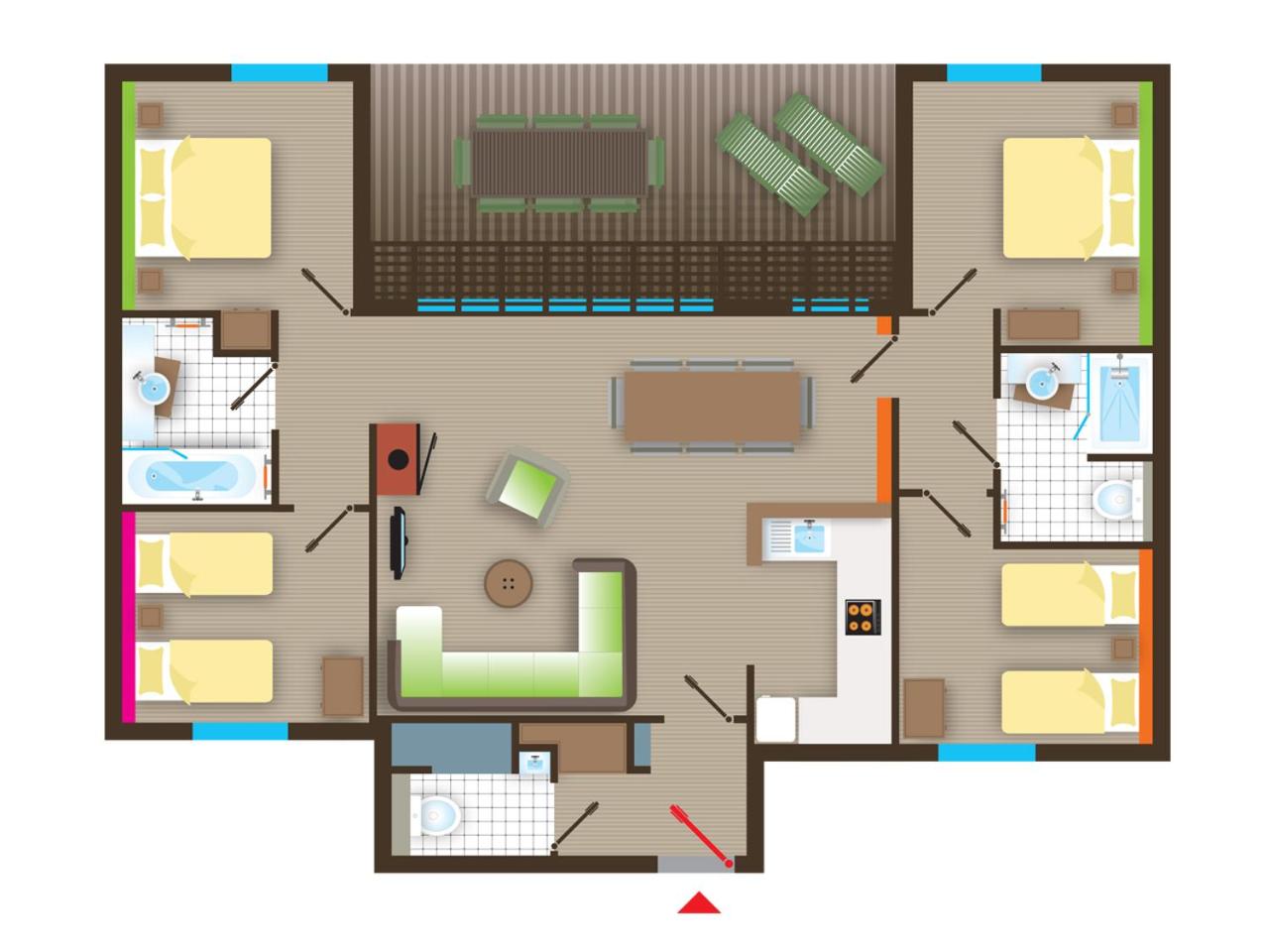 Bungalow Supérieur. Ce cottage dispose dune grande porte coulissante souvrant sur lespace extérieur doté dune terrasse privée meublée. Le gîte comprend 2 chambres lits jumeaux, 2 chambres doubles, une salle de bains avec baignoire spa, une salle de bains avec douche et des toilettes séparées. La cuisine entièrement équipée est dotée dun lave-vaisselle et dune machine à café Nescafé. La pièce à vivre est agrémentée dune cheminée. Le linge de lit, les serviettes et un kit de cuisine sont fournis. Les lits sont faits à votre arrivée. Un lit bébé et une chaise haute pour enfants sont fournis. Vous disposerez de toilettes séparées et d’un parking à proximité du cottage. ;