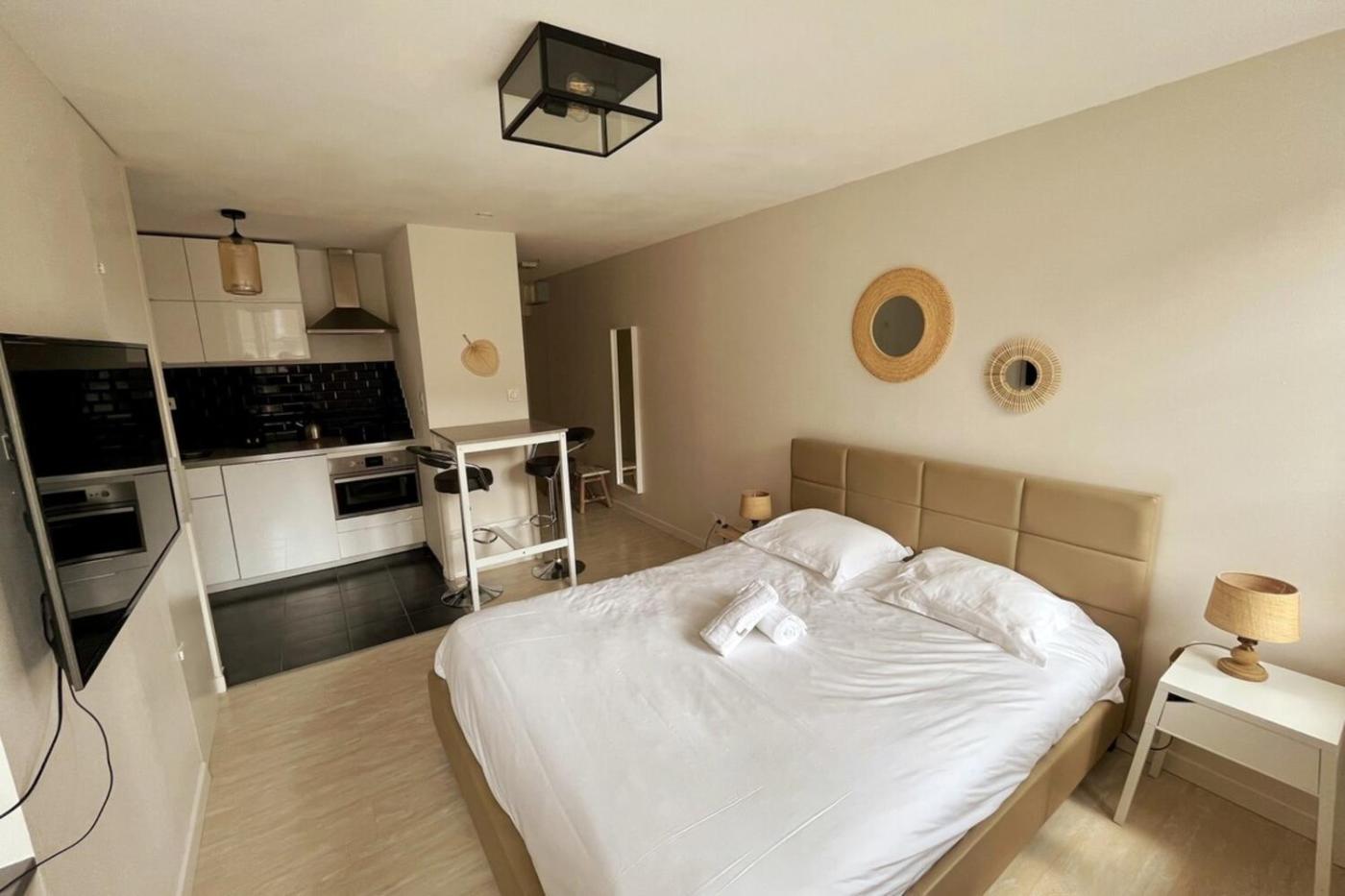 Appartement 1 Chambre. The apartment features 1 bedroom and 1 bathroom with a shower and free toiletries. In the well-equipped kitchen, guests will find a stovetop, a refrigerator, a dishwasher and kitchenware. The apartment provides a TV, a coffee machine, a dining area, heating as well as city views. The unit offers 1 bed.