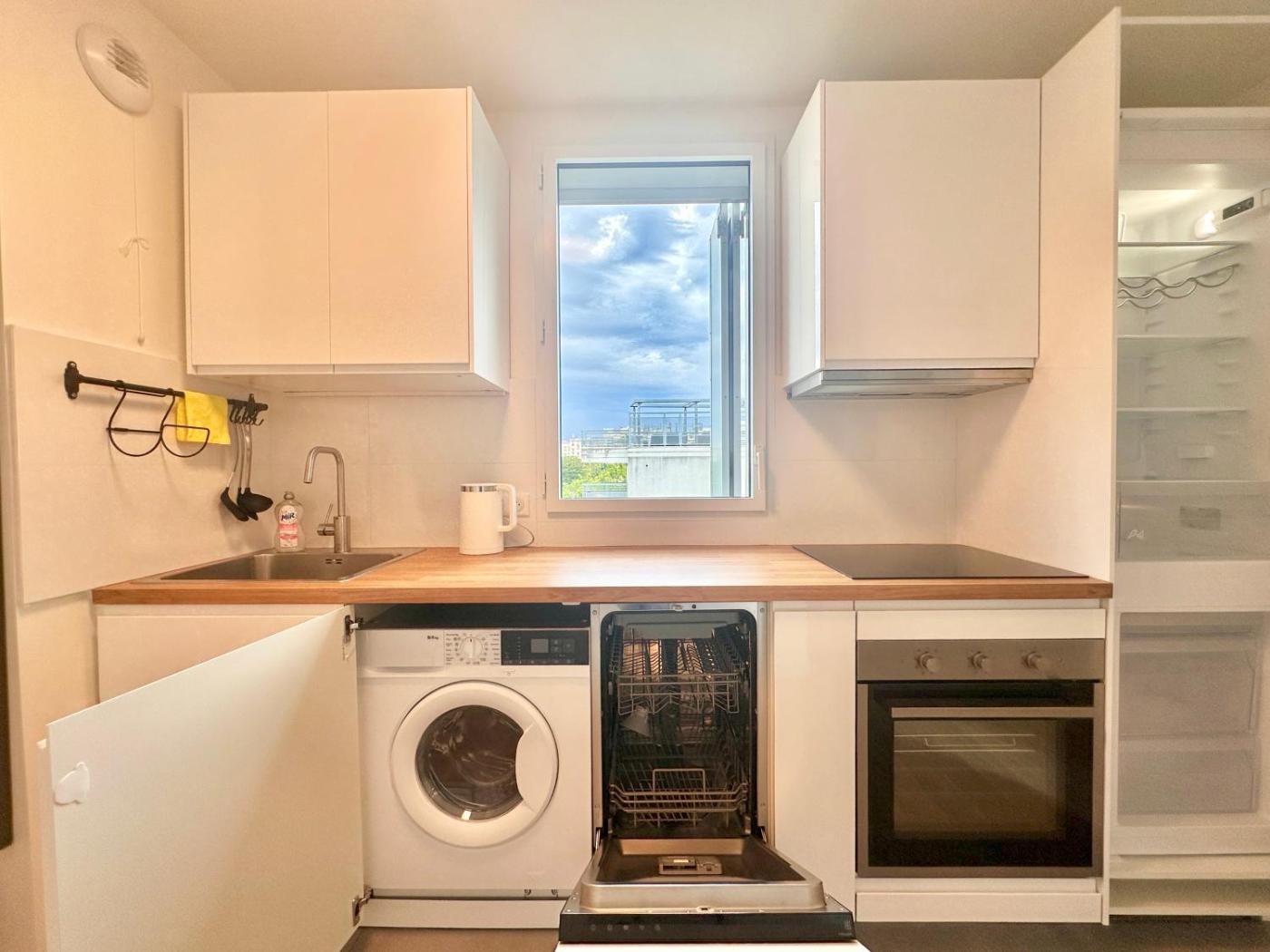 Appartement 2 Chambres. The apartment has 2 bedrooms and 1 bathroom with a shower and free toiletries. Guests can make meals in the kitchen that features a refrigerator, a dishwasher, kitchenware and an oven. The apartment features a washing machine, a coffee machine, a wardrobe along with heating. The unit has 2 beds.