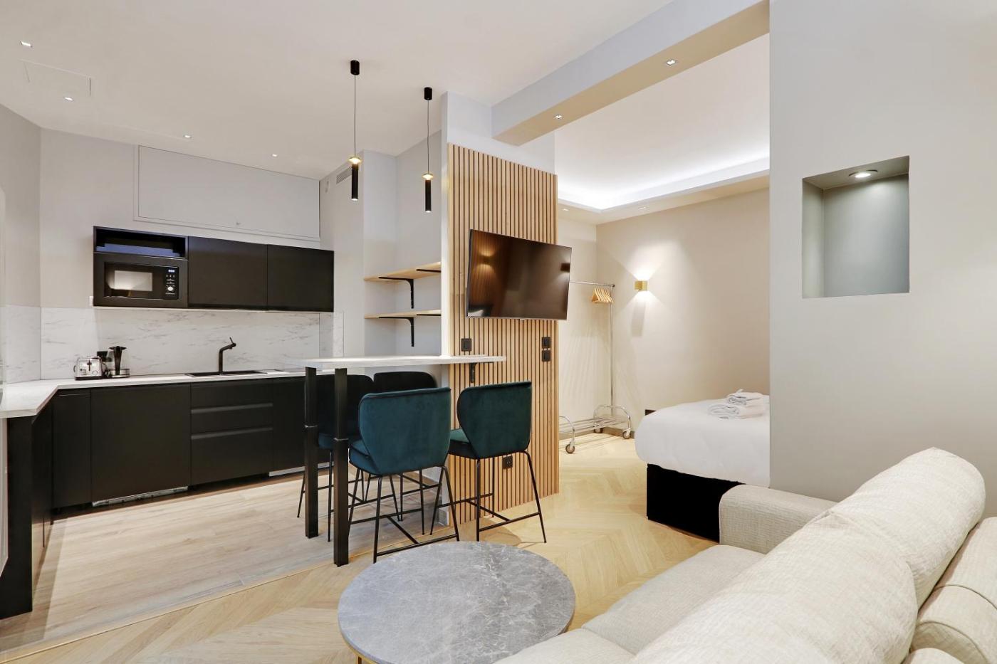 Studio. La cuisine bien équipée est munie de plaques de cuisson, d’un réfrigérateur, d’un lave-vaisselle et d’ustensiles. Le studio dispose de la climatisation, d’un lave-linge, ainsi que d’une salle de bains privative avec une douche et un sèche-cheveux. Ce logement comprend 2 lits.