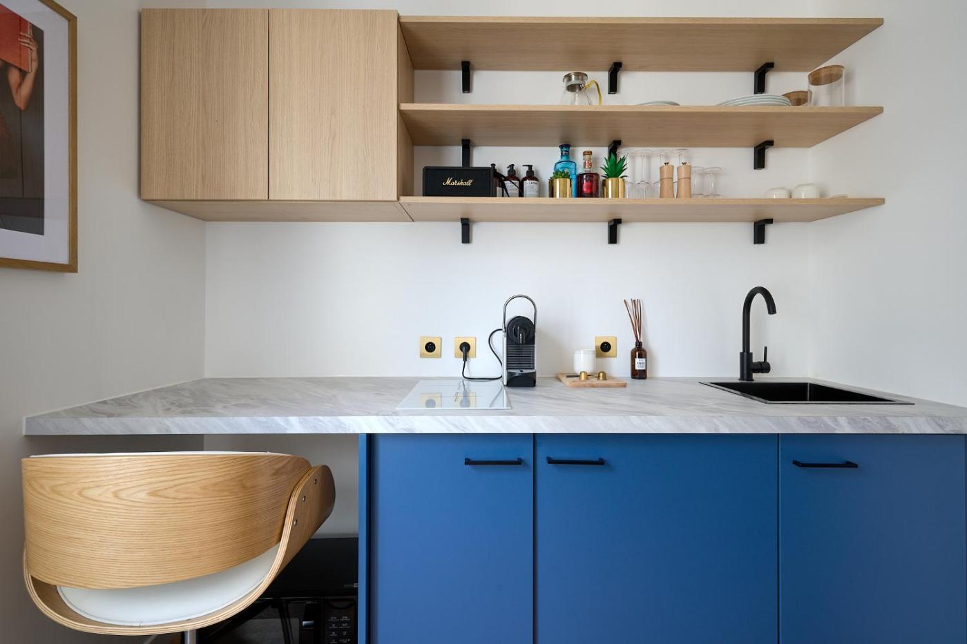 La cuisine est pourvue d’un réfrigérateur, d’un micro-ondes et d’une plaque de cuisson. Elle est également dotée d’une machine à café.
