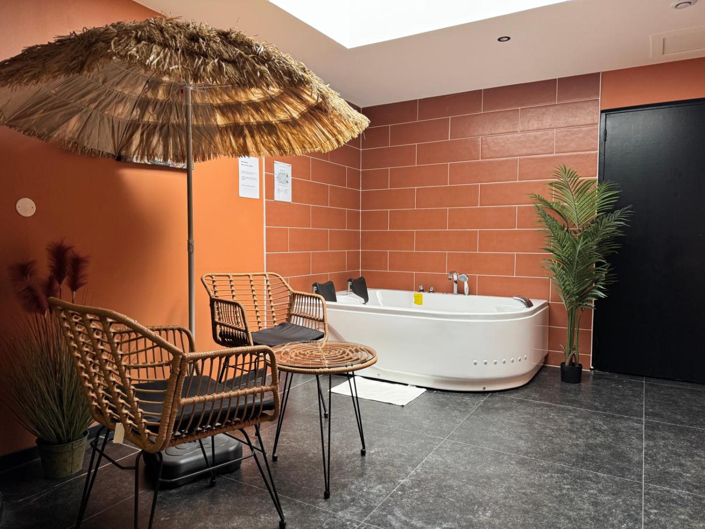 Appartement 1 Chambre. This apartment provides a hot tub. Guests can make meals in the kitchen that comes with a stovetop, a refrigerator and a microwave. The apartment features tiled floors, a seating area with a flat-screen TV with streaming services, a private entrance, soundproof walls, as well as a tea and coffee maker. The unit offers 1 bed.