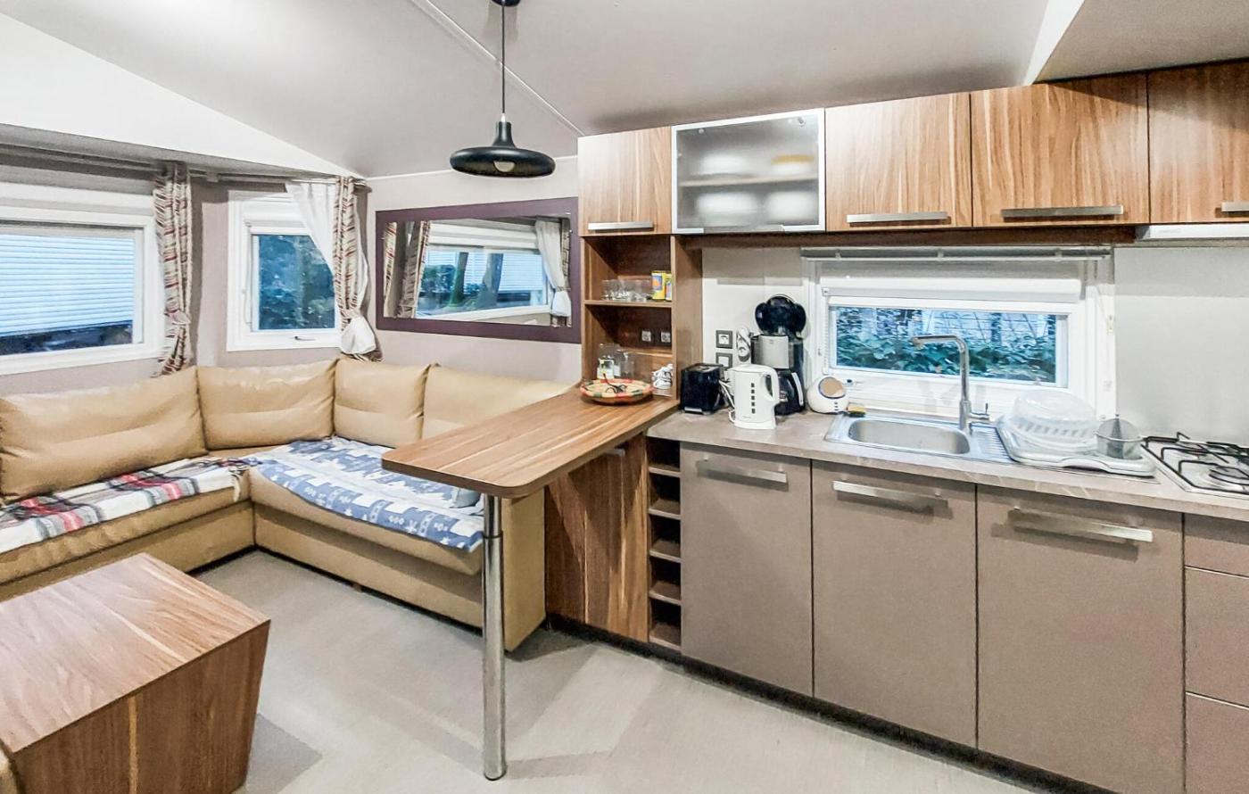 Mobile Home. Featuring 2 bedrooms and 1 bathroom with a shower, this mobile home offers a well-fitted kitchen and a terrace. Guests will find a stovetop, a refrigerator, a dishwasher and kitchenware in the well-equipped kitchen. The mobile home also has a barbecue. This mobile home features a private entrance, a tea and coffee maker, a TV and an outdoor dining area. The unit has 3 beds.