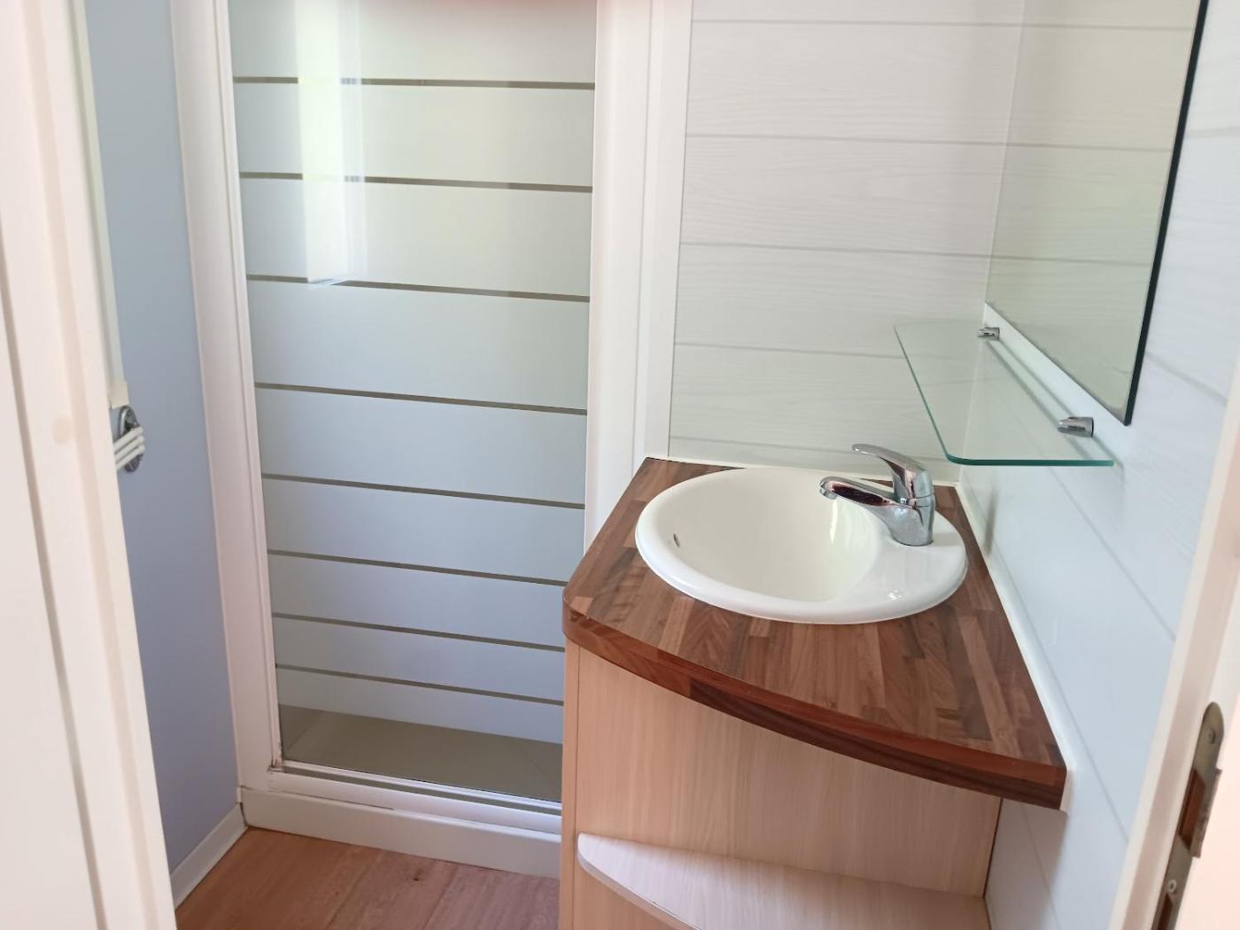 Cette maison de vacances comporte 2 chambres, 1 salle de bains avec une douche, un coin salon, ainsi qu’une cuisine avec un réfrigérateur.