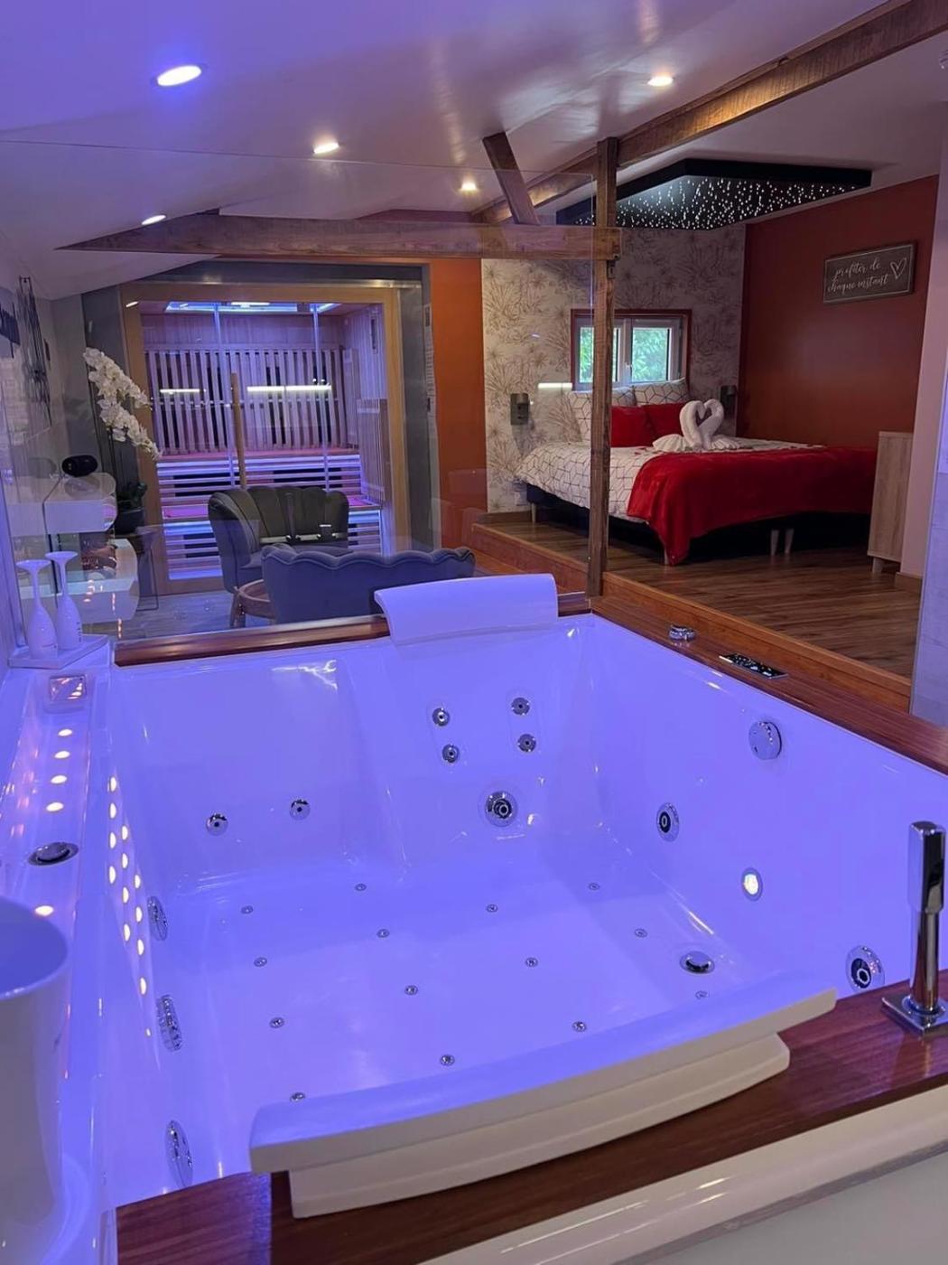Chalet 1 Chambre. Guests will have a special experience as this chalet offers a hot tub, a spa bath and a sauna. Featuring a private entrance, this chalet also consists of 1 bedroom, a seating area and 1 bathroom with a shower and a hairdryer. In the kitchenette, guests will find a stovetop, a refrigerator, a microwave and a toaster. Boasting a terrace with garden views, this chalet also provides a tea and coffee maker and a flat-screen TV with streaming services. The unit offers 1 bed.