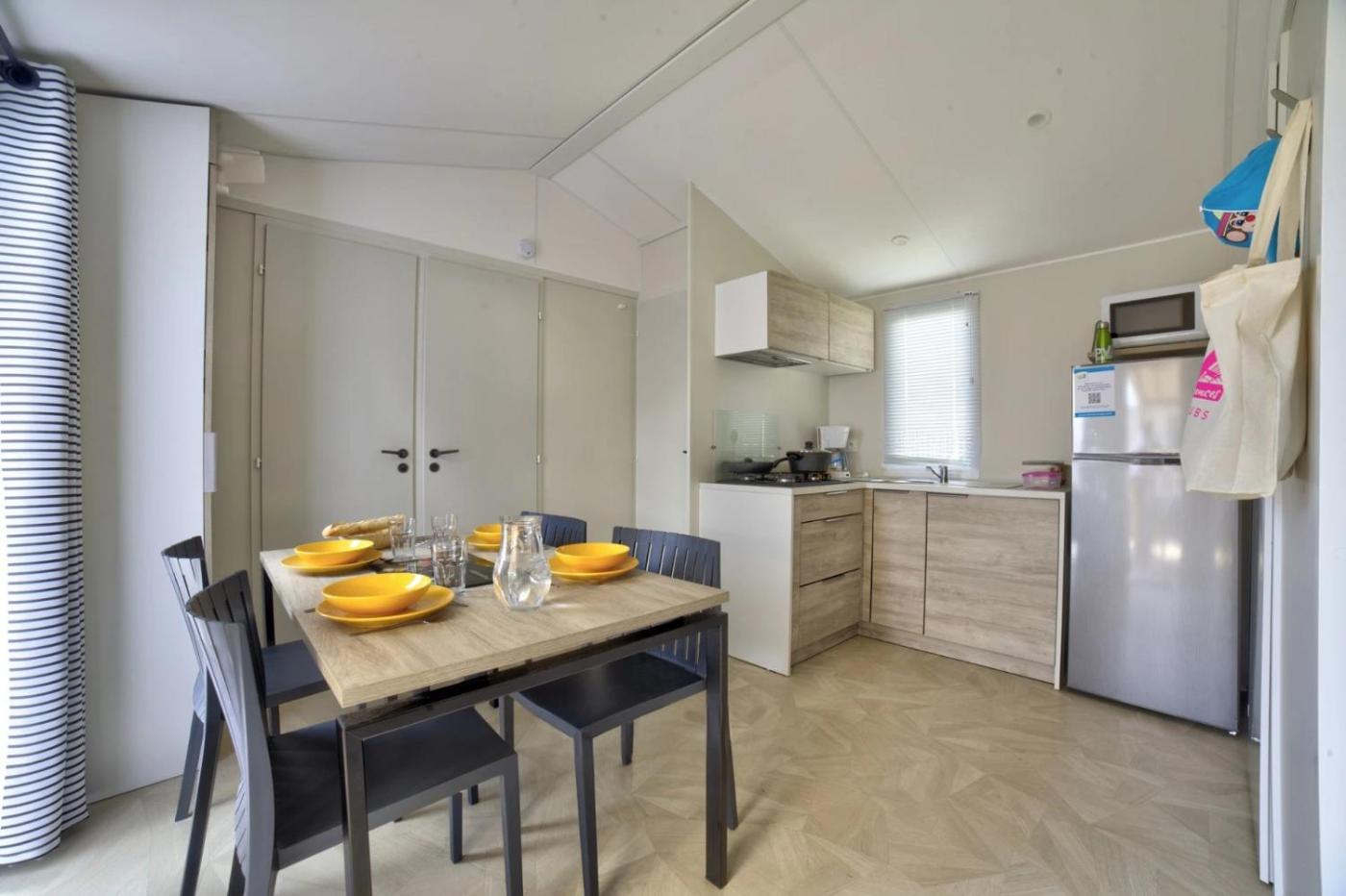 Mobile Home. The sauna is the standout feature of this mobile home. Boasting a private entrance, this mobile home also comes with 1 living room, 2 separate bedrooms and 1 bathroom with a shower. The well-fitted kitchen has a stovetop, a refrigerator, kitchenware and a microwave. This mobile home features a TV. The unit has 4 beds. ;