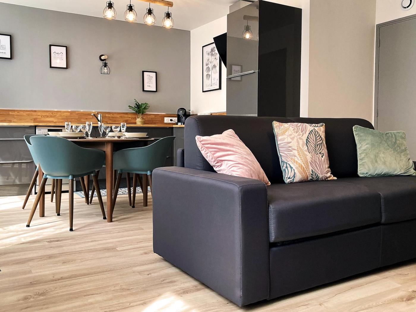 Appartement 1 Chambre. This apartment boasts a hot tub and a sauna. Featuring a private entrance, this apartment comprises 1 living room, 1 separate bedroom and 1 bathroom with a bath and a shower. Guests can make meals in the kitchen that comes with a stovetop, a refrigerator, a dishwasher and kitchenware. There is a washing machine, soundproof walls and a terrace and complimentary winechampagne is provided for guests. The unit offers 2 beds.